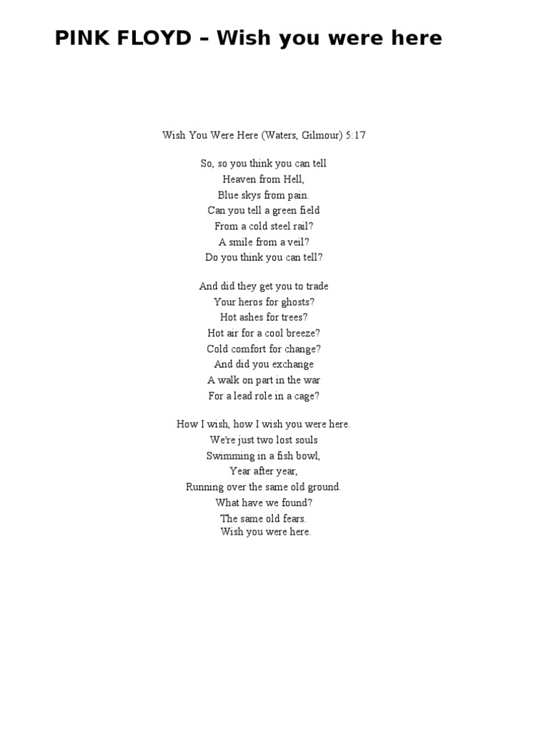 Wish You Were Here Pink Floyd Lyrics Deutsch